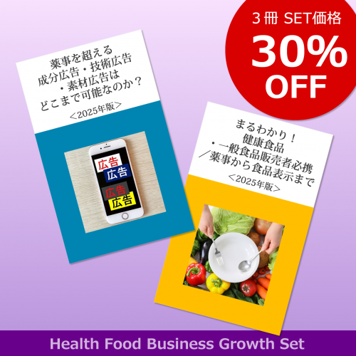 【30%オフ】健康食品ビジネスグロースセット「薬事を超える成分広告・技術広告・素材広告はどこまで可能なのか?」+「まるわかり!健康食品・一般食品販売者必携/薬事から食品表示まで」PDF・2025年版